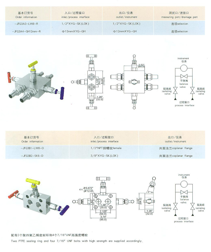 變送器的零校準。 一體化三閥組三個(gè)閥門(mén)可以與:3051,3095,1151,EJA,FX-2,FCX-A / C和霍尼韋爾ST3000系列變送器連接。